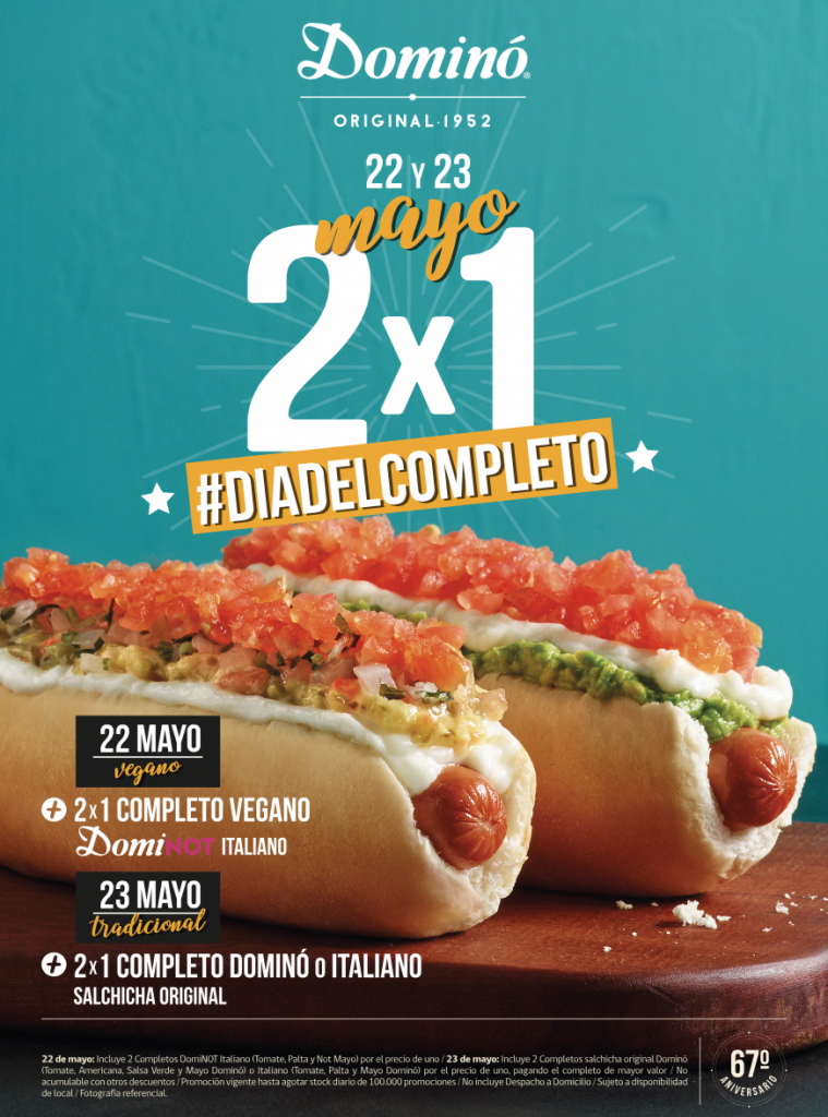 Este jueves, se celebra el día del completo y los amigos de Dominó, además también celebrarán por primera vez el 22 de mayo, el día del completo vegano DomiNOT que ya les contamos en una nota anterior.