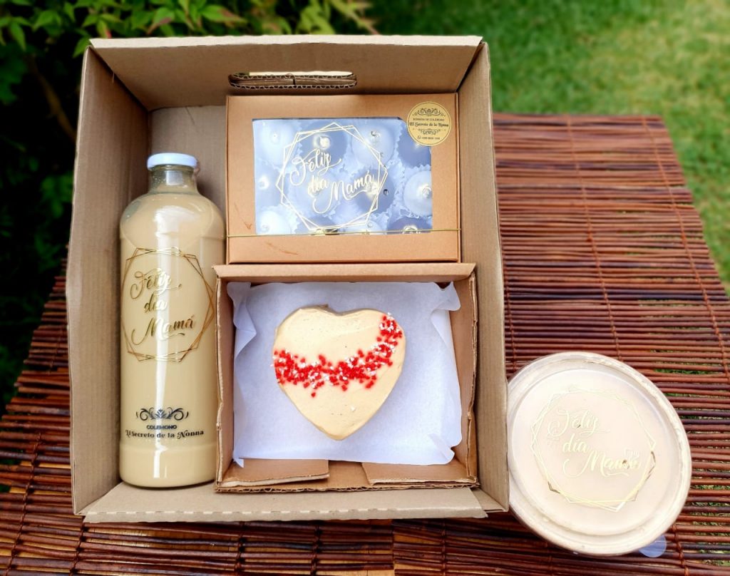 Pack 4 Full: Un litro de colemono en caja de madera, un helado de litro con o sin alcohol, sabor tradicional o colemono con lúcuma, una caja de bombones de doce unidades con o sin alcohol y una torta para cuatro personas rellena con crema de colemono con manjar o mermelada de damasco. Todo a 35 mil pesos.
