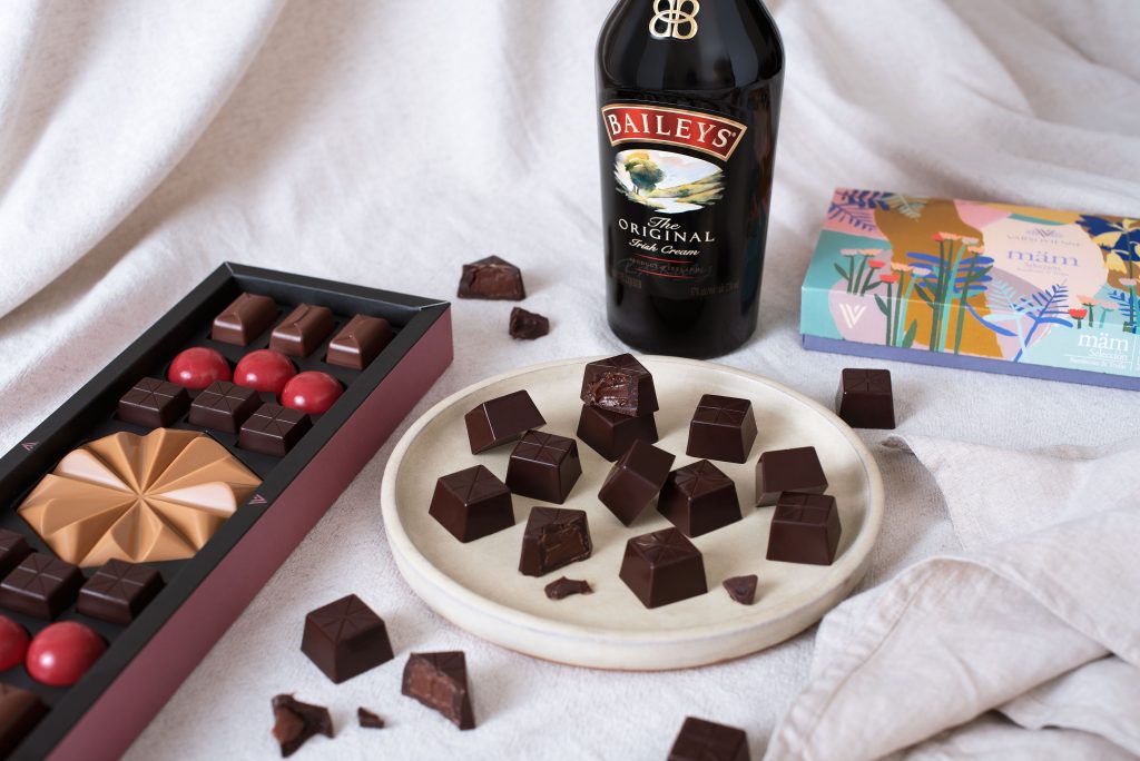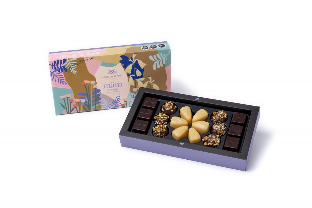 Una de ella es la Caja Mam Grande de 315 grs, una selección de exquisitos bombones con los mejores rellenos de inspiración frutilla, praliné y un nuevo y cremoso bombón de Baileys. En el centro 2 tabletas de chocolate macizos con un chocolate Rubio 34% Cacao y otro con nuestro clásico chocolate de Leche 36% Cacao. La Caja Mam de 195 grs. es parte de la edición y es una selección de un cremoso bombón de Baileys, trufas de Nutella y un bombón de maracuyá relleno de caluga Toffee.