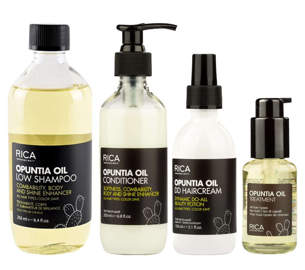 Opuntia Oil Low Shampoo y Conditioner. Textura ligera y cremosa para todo tipo de cabellos, con aceite de opuntia, hidrolizado de keratina, vitamina E, extracto de cáscara de nuez y de castaño. Entrega brillo y cuerpo.