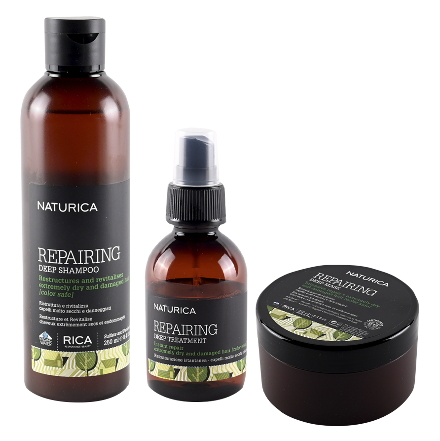 Repairing Deep. Indicado para cabellos muy secos y dañados, porque reestructuran y revitalizan el cabello en profundidad. El Shampoo tiene aceite de oliva y ceramidas; Acondicionador con proteína de trigo y vitamina E, y Máscara con aceite de pistacho y extracto de keratina.