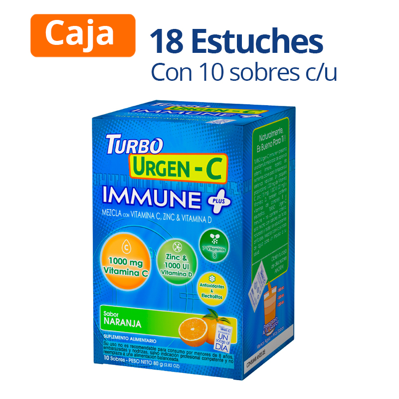 La presentación de Turbo Urgen-C Immune es un estuche que contiene 10 sobres, cada sobre contiene 8 gramos de producto que debe ser disuelto en 150 ml de agua y tiene sabor a Naranja, sin sabor a “remedio”.