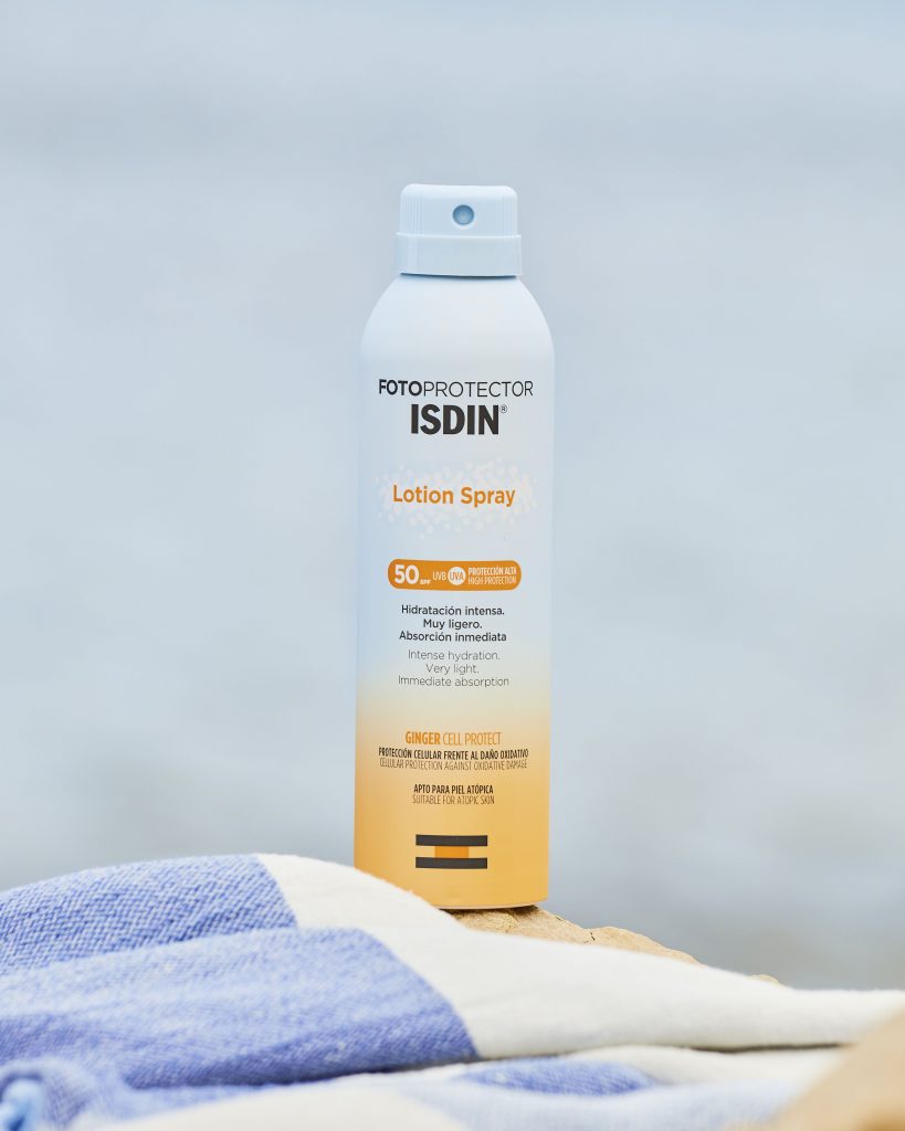 Fotoprotección invisible y ligera para piel mojada. Transparente, fresco y de secado inmediato, de alta protección UVB/UVA SPF50 de fórmula mejorada con Ginger Cell Protect, un extracto de jengibre 100% natural de alto contenido en antioxidantes, ofrece protección celular frente al daño oxidativo. La tecnología Wet Skin permite su absorción tanto en piel mojada como en piel seca sin dejar residuo blanco y manteniendo el factor de protección. Es un producto resistente al agua que permite su aplicación en cualquier dirección y es apto para todo tipo de pieles, incluida piel sensible y/o atópica. PVP: 18.490 ISDIN Lotion Spray SPF 50 Fotoprotector en loción hidratante, ligera y de absorción inmediata, con alta protección UVA/UVB SPF50. Es una loción que hidrata intensamente la piel dejándola suave y sedosa, tan ligero como una segunda piel que se puede aplicar en cualquier parte del cuerpo, incluso en las zonas de difícil acceso, gracias a la válvula que facilita una difusión continua, homogénea y en cualquier posición. Gracias a fórmula mejorada con Ginger Cell Protect es un producto que también ofrece protección celular frente al daño oxidativo. PVP: 18.490