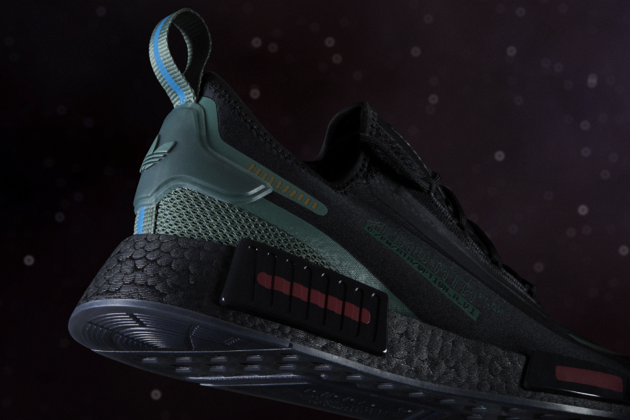 Haciéndose eco de la famosa nave estelar del temido Boba Fett, la robusta adidas Ozelia presenta una silueta con suaves estampados de camuflaje verde y un panel trasero rojo que captura bien el nivel militar de la nave. El NMD R1 tiene dos versiones, la primera hace referencia a la armadura del cazador legendario en la combinación de colores predominantemente negra y detalles en el panel posterior que canalizan el icónico jet pack del personaje. La lengüeta presenta el logotipo de la cresta y el número de clon de Boba Fett aparece en la entresuela. La otra versión presenta un tono naranja inspirado en su mentor y aliado Bossk, el logo de su traje se agrega en la lengüeta, mientras que la plantilla trae su imagen.