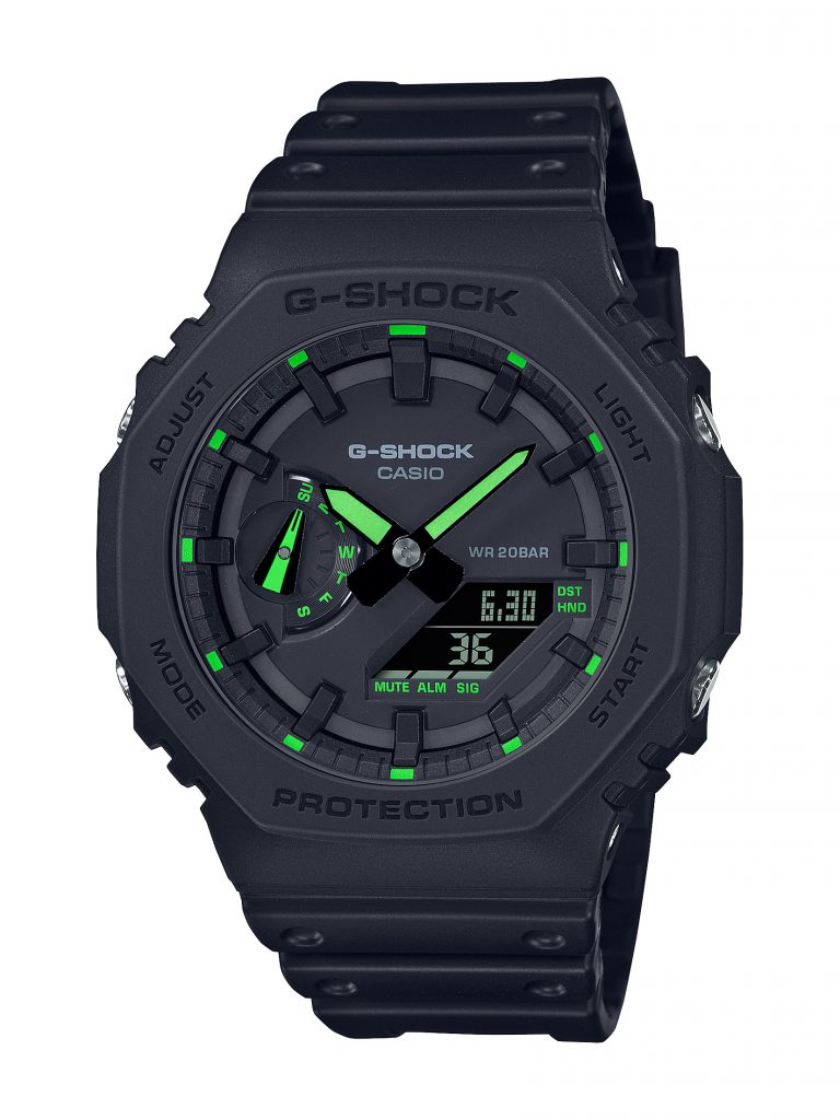De acuerdo con las elecciones de atuendo que toman grandes referentes en la industria, el neón estará presente durante toda la temporada, tanto en la ropa y el calzado como en accesorios. La nueva colección Neon Accent es parte de la serie GA-2100, relojes compuestos por fibra de carbono y con un diseño octagonal para un look casual y resistente, donde ahora destacan tres nuevos modelos con tonalidades fosforescentes en sus manecillas y marcadores que hacen la diferencia tanto en el día (con sus vibrantes colores), como en la noche (brillando en la oscuridad y facilitando la lectura en cualquier ambiente con poca iluminación).
