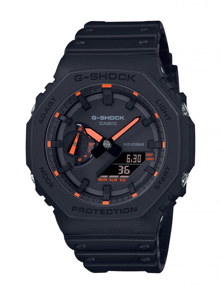 La nueva familia de relojes G-SHOCK Neon Accent en los colores azul GA2100-1A2, naranja GA2100-1A4 y verde GA2100-1A3 fosforescente sobre negro matte puede ser combinada con todos los estilos y atuendos que puedas imaginar, ya sean deportivos, casuales o elegantes, ya que su diseño lo hace un reloj que puede seguirte el ritmo a través de cualquier tendencia.
