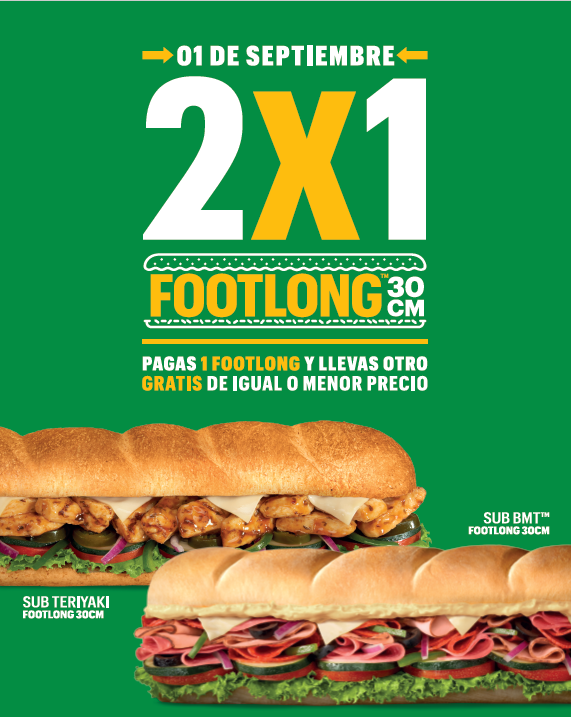 El inicio de la Fiestas Patrias está a la vuelta de la esquina y Subway, la cadena de sándwiches más grande del mundo y muy pronto el restaurante de comida rápida con más restaurantes a nivel nacional (200), viene a celebrarlo “con todo”. Por esta razón, y para iniciar el mes con gran celebración, el próximo jueves 1 de septiembre habrá promoción 2×1 en cualquier sabor de Footlong (30 cms.) a nivel nacional.