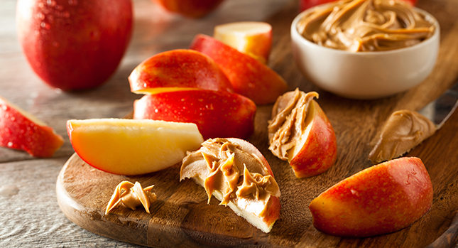 7. Mantequilla de maní en galletas o rodajas de manzana Pon a disposición de los niños un pocillo con mantequilla de maní y deja que los niños las unten en galletas integrales, galletas de arroz o manzanas en rodajas.