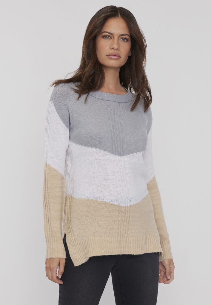 Un atuendo completo incluye un sweater color block cerrado gris ($7.990), un botín con hebilla café ($10.990) y un jeans skinny de tiro alto ($9.990).