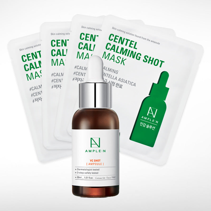 Pack Sérums Antimanchas y Reparación Centel Calming Sérum Vitamina C AMPLE:N 30ml + 4 Mascarillas Centella Asiática AMPLE:N