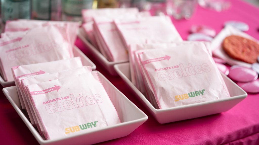 çA su vez, todos aquellos interesados en aportar a la causa pueden hacerlo comprando en Subway la ya conocida “galleta rosa” (tradicional masa de vainilla de Subway -esta vez de color rosa- con chispas de chocolate blanco), que estará disponible en todos los restaurantes del país durante octubre.