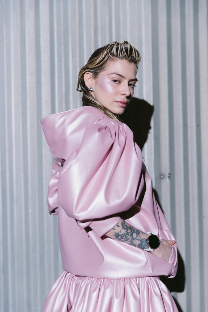 Más que trabajar con la silueta, Marín trabaja con volúmenes, la ropa va sin tallas, para poder dar realce al diseño. Una de las piezas presentadas fue este vestido en rosa con enfoque femenino e inspirado en moda parisina, está fabricado con cuerina producida en Chile y su falda tiene una caída que imita la flor icónica del modelo de 41mm del HUAWEI Watch GT4.