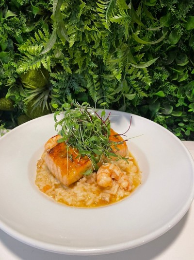 Salmón Austral a la plancha con risotto de pulpo y camarón