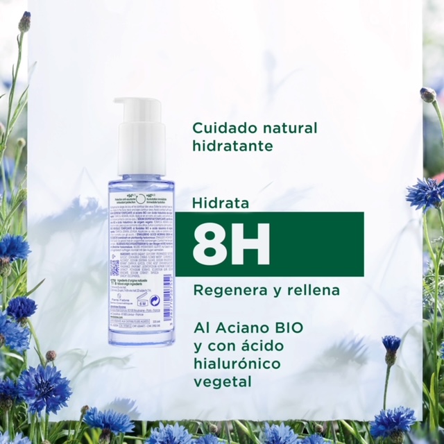 Este poderoso producto alisa, tonifica e hidrata; es un cuidado facial formulado con un 97% de ingredientes de origen natural que combina el poder del aciano orgánico cultivado con agricultura ecológica para extraer un agua floral pura y segura con propiedades calmantes y descongestionantes, con Ácido Hialurónico de origen 100% vegetal, reservorio natural de agua que hidratara tu piel intensamente.