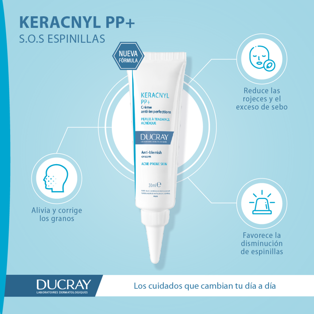 Crema Anti-imperfecciones Keracnyl PP+: Favorece la reducción de granos inflamados y espinillas, limita las marcas residuales, y controla el brillo.