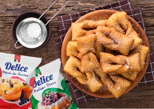 Ingredientes para la masa: ½ kilo de harina blanca , sin polvo de hornear, 1⁄2 taza de leche, 2 huevos, 70 grs de margarina Master Export Horneo, 3/4 tazas de azúcar, 1 pizca de sal, 1 cucharada de polvos de hornear delice, 1 cucharada de esencia de vainilla. Además, para decorar azúcar glass delice, que tiene la cualidad de no absorberse en la masa, por lo que no tendrá que espolvorear, cada vez que los sirva. Importante, utilizar un buen aceite apto para freír, como el Vita frit, que resiste altas temperaturas sin degradarse.
