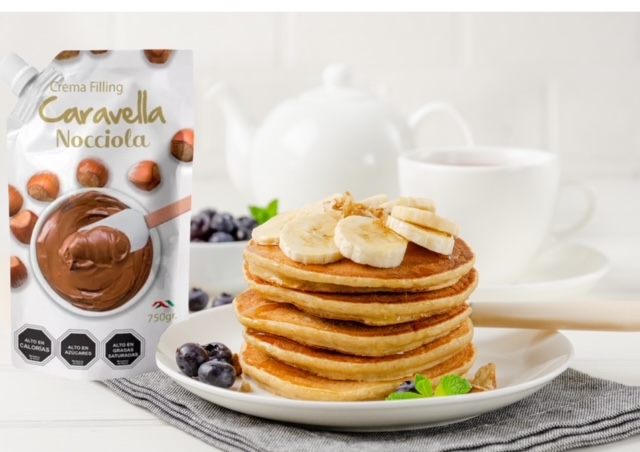 Procesar la avena, polvo de hornear, leche y banana hasta que esté una mezcla suave. Agregar huevos y vainilla y mezclar hasta combinar. Dejar reposar 5 minutos para que espese la mezcla. Untar con mantequilla o aceite una plancha o sartén. Calentado (fuego medio). Verter la mezcla en cantidad de 1/4 taza y cocinar hasta que se forme burbujas o dore. Voltear y dejar dorar. Rellenar con crema Nocciolla Caravella, añadir berries y ¡disfrutar!.