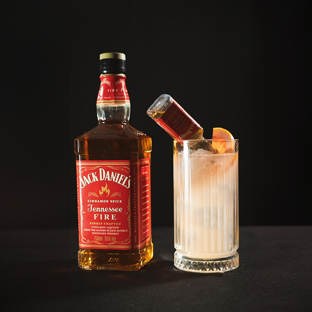 Preparación: en un vaso largo, agregar, hielo Jack Daniel’s Fire y el mix de jugo de pomelo y limón, finalmente terminar con agua tónica Premium, revolver ligeramente, decorar con canela y/o rodaja de pomelo rosado.