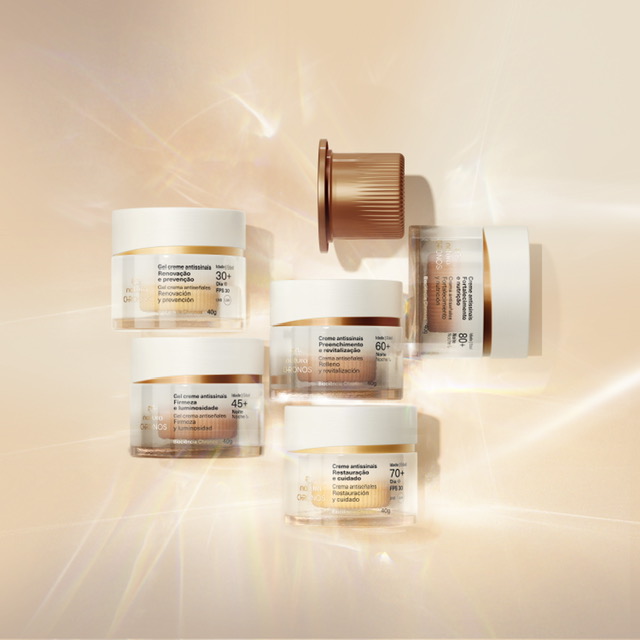 La línea dermocosmética Natura Chronos Derma ofrece tratamientos específicos para pieles de 30+, 45+, 60+, 70+ y ahora, 80+. Cada uno de ellos está disponible en versiones de día y de noche, con beneficios dermatológicamente comprobados bajo los más altos protocolos internacionales.