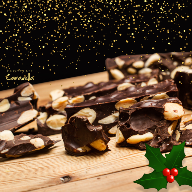 Ingredientes: 200 g de Caravella Dark /150 g de Caravella Leche/ 50 g de mantequilla/ 100 g de almendras tostadas