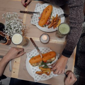 Su dueña, Constanza Oyarce, nos cuenta que “tenemos este nuevo concepto funcionando desde marzo, nosotros trabajamos en un prodcuto pyme por cada sándwich, ensalada o hamburguesa que vendemos”.