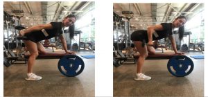 1. Patada de tríceps con mancuerna: Apoyados en una banca, con la espalda recta, debemos contar con unamancuerna en una mano, sosteniendo la carga en flexión de 90° del codo. Desde ahí se extiende y traslada la carga hacia la horizontal, dejando el brazo totalmente estirado.