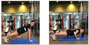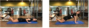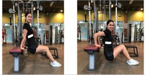 2. Fondo de tríceps: Sentada en una banca, dar un paso hacia el frente de modo que tu cuerpo quede sujeto de tus brazos. Bajar el peso de tu cuerpo hacia el piso flexionando tus codos hasta llegar a los 90° y volver a subir llegando a la extensión completa. Es muy importante mantener el control del hombro.