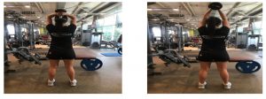 4. Tríceps tras nuca: De pie con una mancuerna entre las manos, sostener el peso detrás de la nuca con los codos flexionados fijando el hombro. Desde ahí extender los codos llevando el peso hacia el techo. Mantén el abdomen en contracción durante la ejecución del movimiento.
