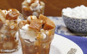 4. Armar los vasitos disponiendo una capa de merenguitos, una de cubitos de queque previamente remojados en la mezcla de leche evaporada y una de manjar con leche. Repetir hasta completar todos los vasitos.