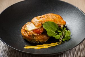 Cancato de salmón acompañado de gratín de papa chilota con salsa de erizo