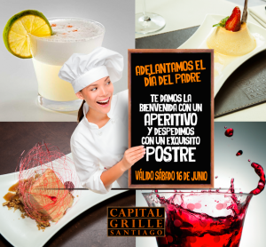 Esto y más nos ofrece Capital Grillé y si adelantas la fecha, o sea, el sábado 16 de junio, el aperitivo y postre corre por cuenta de los amigos de este gran restaurant gourmet.