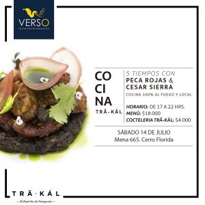 Este sábado 14 de julio, el chef César Sierra junto a Peca Rojas nos harán disfrutar de una cocina diferente, basada siempre en la sustentabilidad de los elementos que la naturaleza nos ofrece y llevándolos a su máximo potencial integrando a TRÄ·KÁL, el espíritu de la Patagonia, en sus preparaciones.
