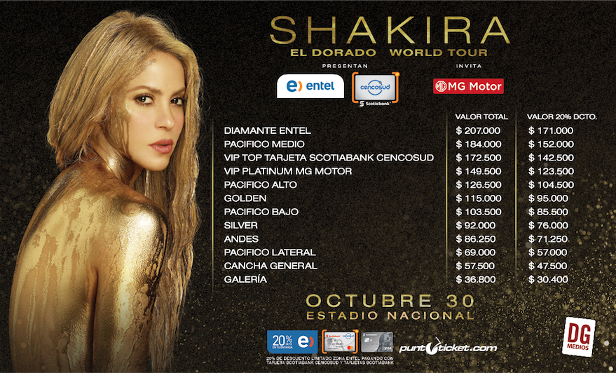 Nuestra colombiana favorita trae a Chile el esperado Dorado World Tour, gira con la que vuelve a los escenarios luego de años dedicada a su vida personal, la maternidad y crear nuevo material. Con sus característicos movimientos de cadera y un puñado de hits, la artista se presentará en el Estadio Nacional el próximo 30 de Octubre y los precios van desde los $35.800 hasta los $207.000. Para adquirir entradas entra aquí.