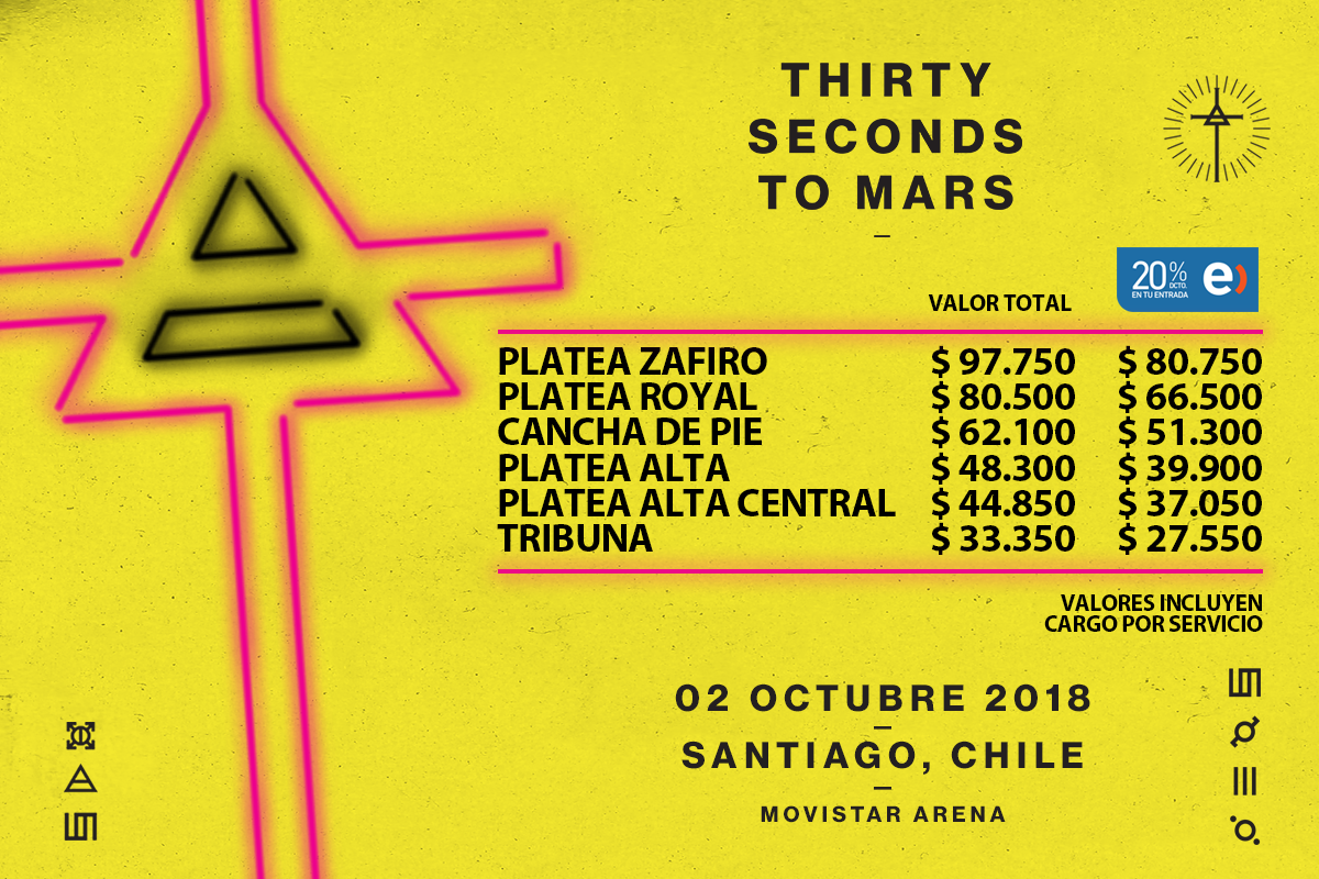 La banda de ventas multiplatino Thirty Seconds to Mars liderada por el ganador del Oscar, Jared Leto, anunció su esperado regreso a Chile. La banda estadounidense se presenta el 2 de octubre en Movistar Arena. Para adquirir entradas ingresa aquí.