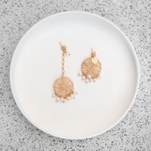 Los aros “Altos y Bajos” generan un efecto único y personal, y le dan vida a cualquier outfit. Con una paleta de colores simple, en la que destaca el blanco, negro y burdeo, cada una de las piezas son tejidas a mano, elaboradas con materiales de alta calidad y siempre con el dorado como tono base.