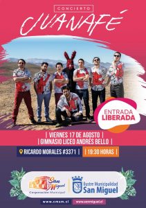 Juana Fe estará este viernes 17 de agosto, a las 19:30 horas en el Gimnasio del Liceo Andrés Bello ubicado en calle Ricardo Morales #3371, San Miguel. La entrada es Liberada.