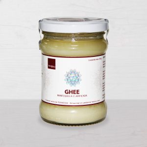 rejuvenecimiento y la longevidad, es puro y se le considera un alimento superior con propiedades terapéuticas. En cuanto a las cualidades más gourmet, el Ghee resalta el sabor de las comidas e incrementa la absorción de nutrientes. Se puede ocupar para cocinar en reemplazo del aceite y como mantequilla untable.