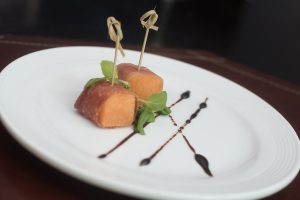 Con un aperitivo agridulce el menú apuesta por abrir los sentidos con notas frescas, para luego dar paso una entrada de dúo de ostras. El plato de fondo ofrece dos alternativas. Bautizado como “Romance Mediterraneo”, los comensales podrán disfrutar de un filete de salmón con croute de curry acompañado con quinoa al chardonnay o bien de un tierno medallón de res, cuyo sabor se complementa con puré de papas rusticas y crocante de jamón Prosciutto.