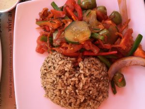 ¿Han probado el arroz con coco? Yo nunca lo había probado y fue amor a primera cucharada, lo contundente del arroz con a la dulzura del coco es magia, y qué me dicen de las verduras salteadas, se ven exquisitas y sí que lo estaban, debo confesar que no me gusta mucho el pepino pero salteado ¡es un manjar!