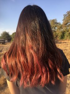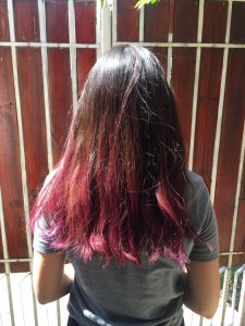 Me decoloré las puntas y traté de hacer una especie de reflejos (todo muy casero), el efecto se veía bien pero, tengo el pelo muy oscuro y al decolorarlo no logré llegar a un tono muy claro, mis puntas quedaron casi blancas pero mientras más arriba el color se hacía más naranjo. Sabía que esto influiría en el resultado final pero, no tenía intención de decolorarme otra vez, por lo que dejé el color como estaba.