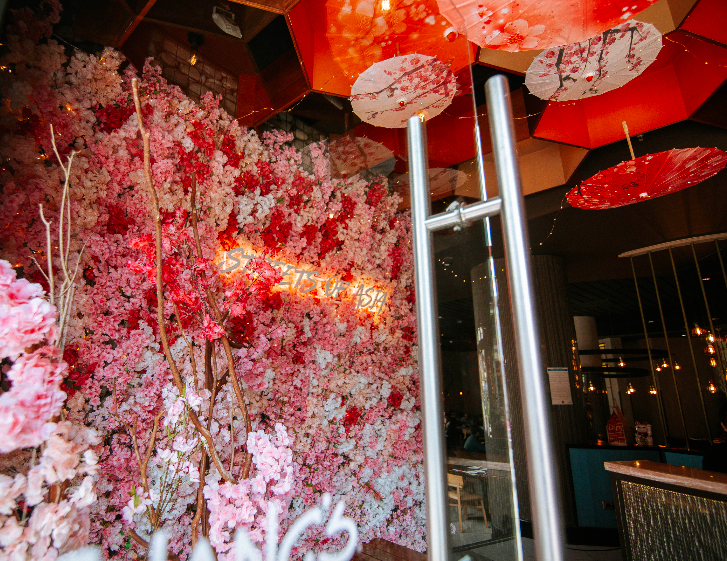 Una espectacular ornamentación de Cherry Bloosoms -que incluye una sopresa instagrameable- , carteles luminosos e imágenes de la arquitectura típica de la cultura