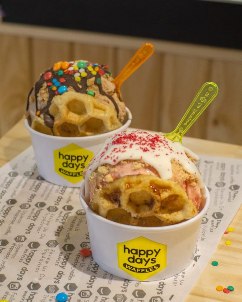 Por esto los emprendedores Angie Fernández y Sergio Sanz creadores de Happy Days Waffles pusieron manos a la obra y crearon unos increíbles y refrescantes Waffles milksake, siguiendo la línea de sus reconocidos waffles pops ofrecen 4 variedades: Sueños de Oreo, La Fiesta en tu Boca, Frutilla Lovers y El Clásico estas maravillas está elaboradas con helado, leche, crema chantilly, un mini waffle y toppings Cada uno lleva una porción de helado, para los más files a los paladares más exigentes crearon el Icecream que está compuesto por helado, tipo sándwich con un toque especial típico de Happy Days.
