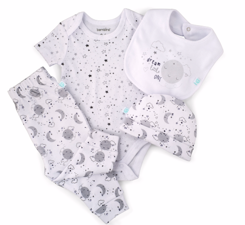 También están los sets de ropa, que viene con la primera tenida completa. En la línea Classic podrás encontrar el baby gift de de 4 piezas de 0 a 6 meses. viene con body, panty, babero y gorrito, todo en una linda presentación en bolsa de gasa.