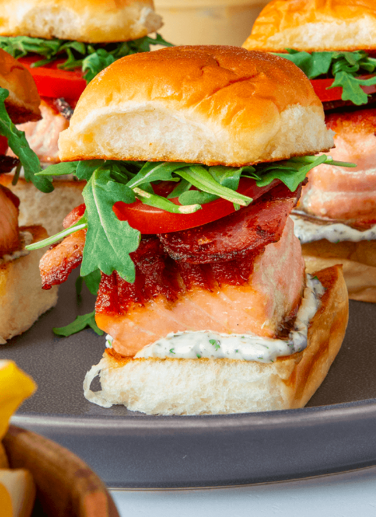Ármalos poniendo mayonesa de alcaparras sobre la base de Rolls, agrega el salmón, el tocino, el tomate y la rúcula. Servir con gajos de limón y ensalada.
