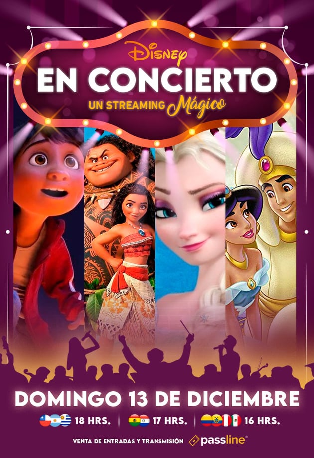 Este 13 de diciembre de 2020 tu hogar se llenará de la magia y el encanto de Disney en un espectacular concierto vía streaming que se dará para toda Latinoamérica y que contará con la dirección musical del gran maestro Marko Santelices Skorin quien estará a cargo de la Orquesta Sinfónica. Los espectadores podrán disfrutar la música de grandes películas de Disney que nos han emocionado a lo largo de nuestra vida: Aladdín, La Bella y la Bestia, Frozen, El Rey león, Coco y muchas otras más. El evento contará con la participación especial de los personajes de Disney, acompañados de proyecciones, bailarines, cantantes y otras sorpresas que los deleitarán.