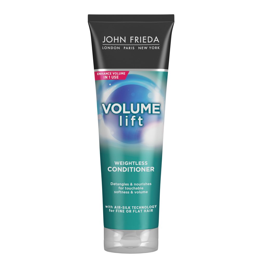 Acondicionador John Frieda® Volume Lift: Esta fórmula acondiciona y desenreda sin peso, infundiendo un volumen visiblemente natural. El acondicionador ligero para cabellos finos mejora el volumen y la plenitud para ayudar a conseguir un cabello suave al tacto con un volumen de aspecto natural.