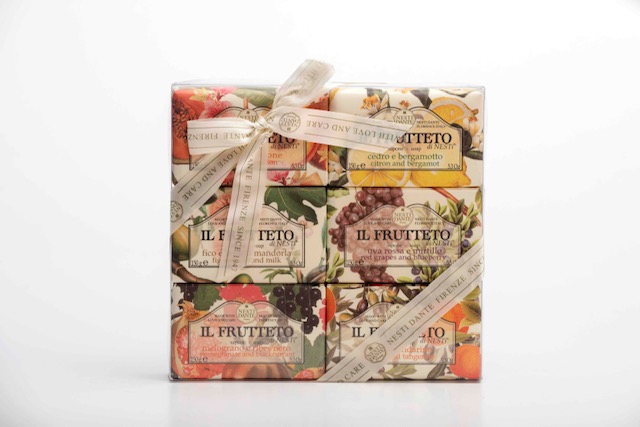 Otras alternativas de 6 unidades son los kits de jabones Dei Colli Fiorentini, con aromas a Lavanda, Ciprés, Amapola, Lirio, Retama de olor y Violeta. Los de la línea Il Frutteto con una selección de Durazno y Melón, Cedro y Bergamota, Higo y leche de Almendra, Uva rosada y Arándano; Granada y Grosella negra y el de Oliva y Mandarina que es una línea particularmente suave y efectiva para todo tipo de piel, y para cualquier edad, tanto en la piel joven y delicada, como en las más maduras y necesitadas de mayor cuidado.