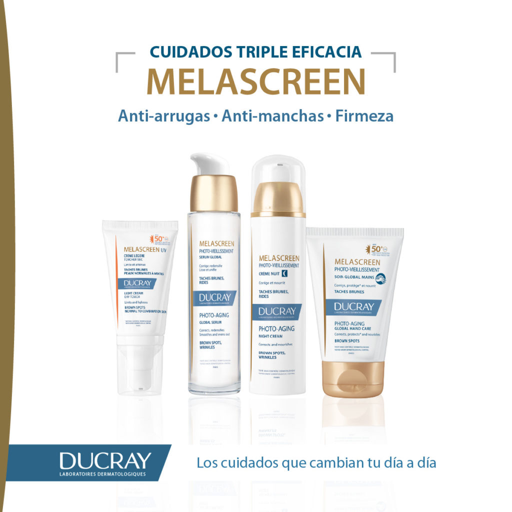Laboratorio Ducray presenta Melascreen su línea de productos dermocosméticos de acción despigmentante compuesta por un serum de día, una crema de noche, un cuidado de ataque, una crema de manos y un protector solar para el rostro. Un tratamiento eficaz de ataque a la hiperpigmentación: esas manchas en la cara, el escote y el dorso de las manos, que indican un exceso de sol y sus efectos sobre la piel, que también son potenciados por las hormonas producidas durante el embarazo o frecuentes en pieles más oscuras, ricas en melanina.