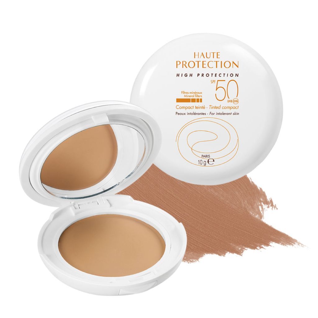 Compacto Mineral FPS +50. Disponible en tonos arena y dorado, otorga alta protección solar y maquillaje para pieles intolerantes a los filtros químicos y a los perfumes.