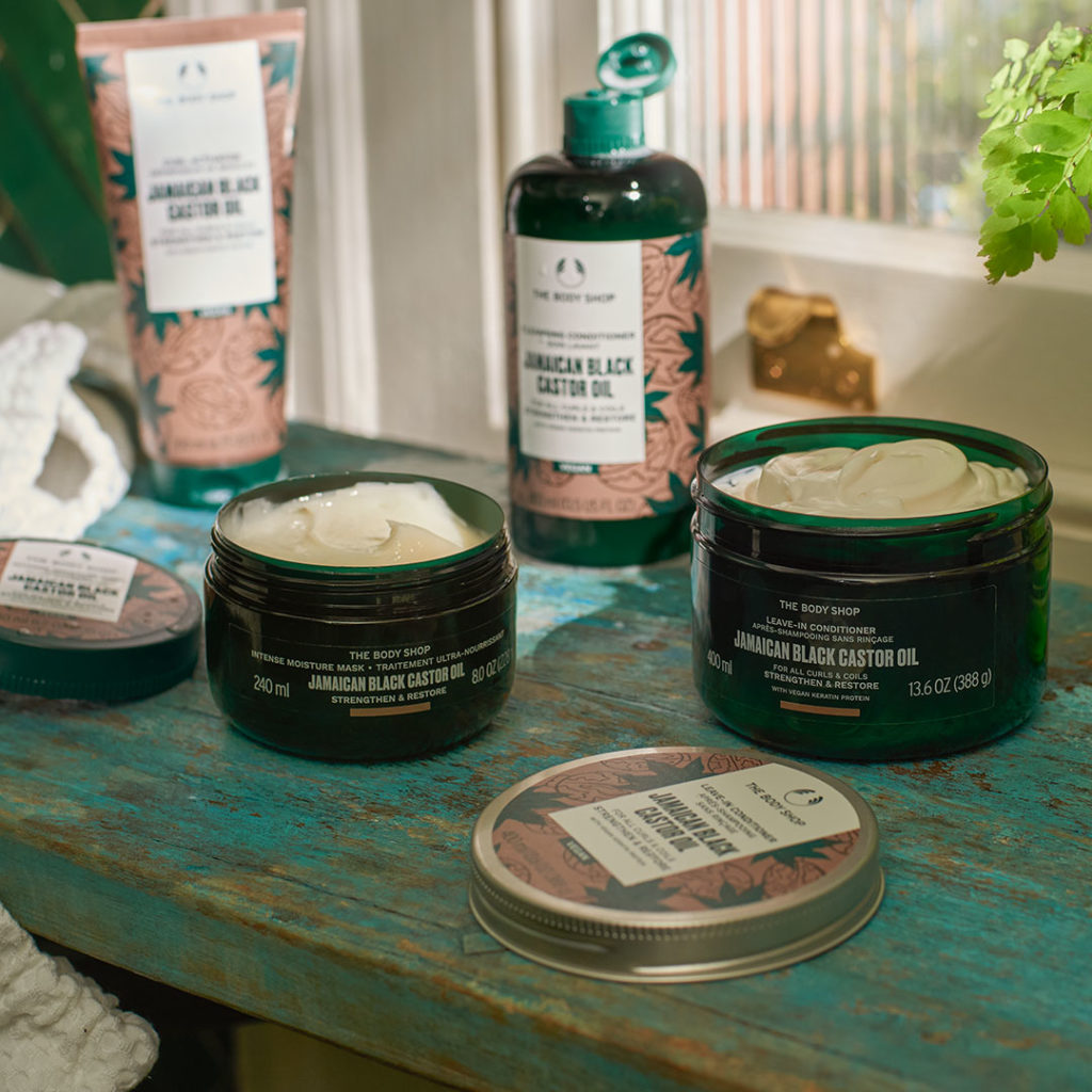 The Body Shop ha trabajado con colaboradores de todo el mundo para escuchar las necesidades de las personas con cabello rizado y afro para desarrollar su nueva línea de cuidado capilar: Jamaican Black Castor Oil. La colaboración representa diversos tipos y texturas de cabello y funciona en los tipos de rizos 3A (rizos más grandes) a 4C (frágil y fino, con forma de z).